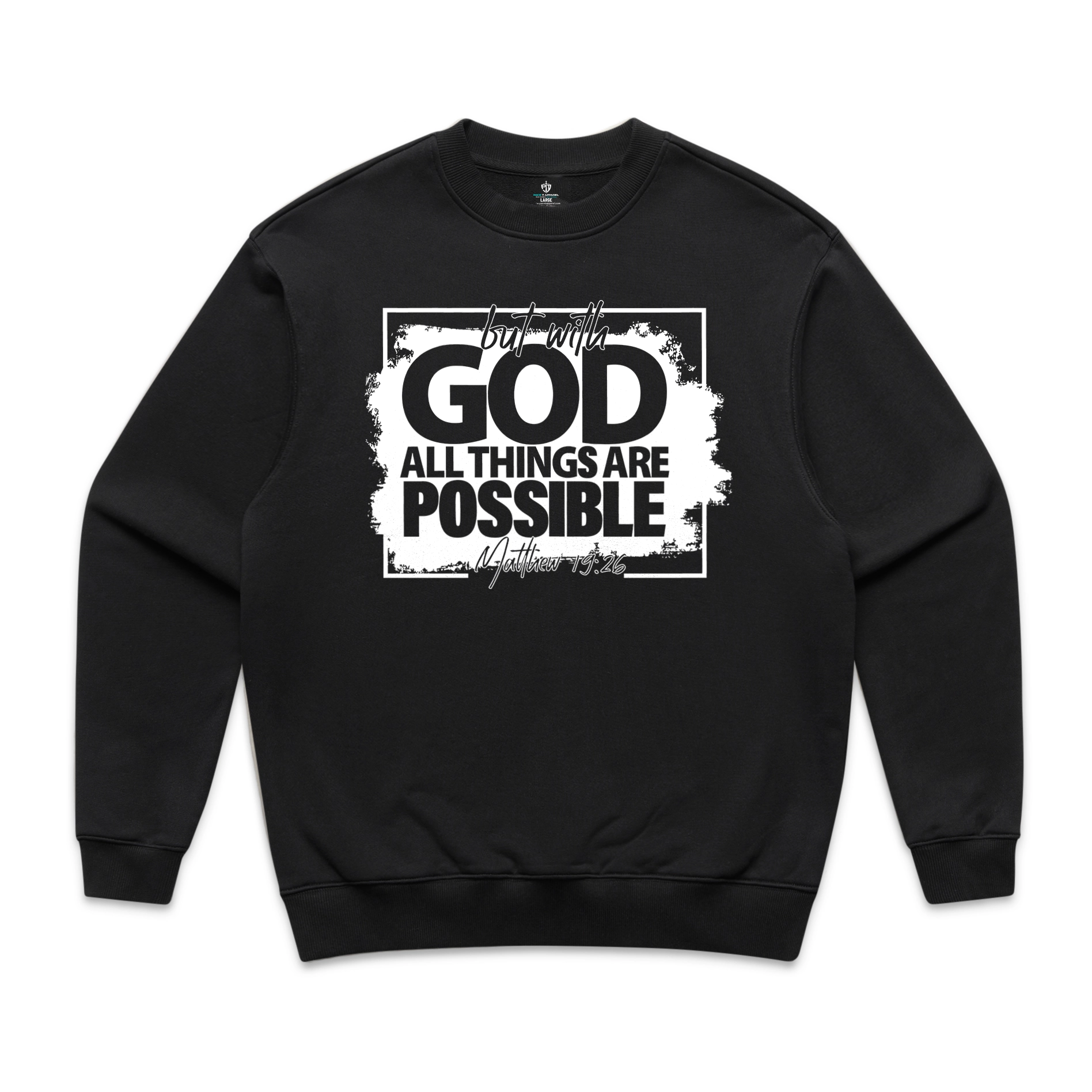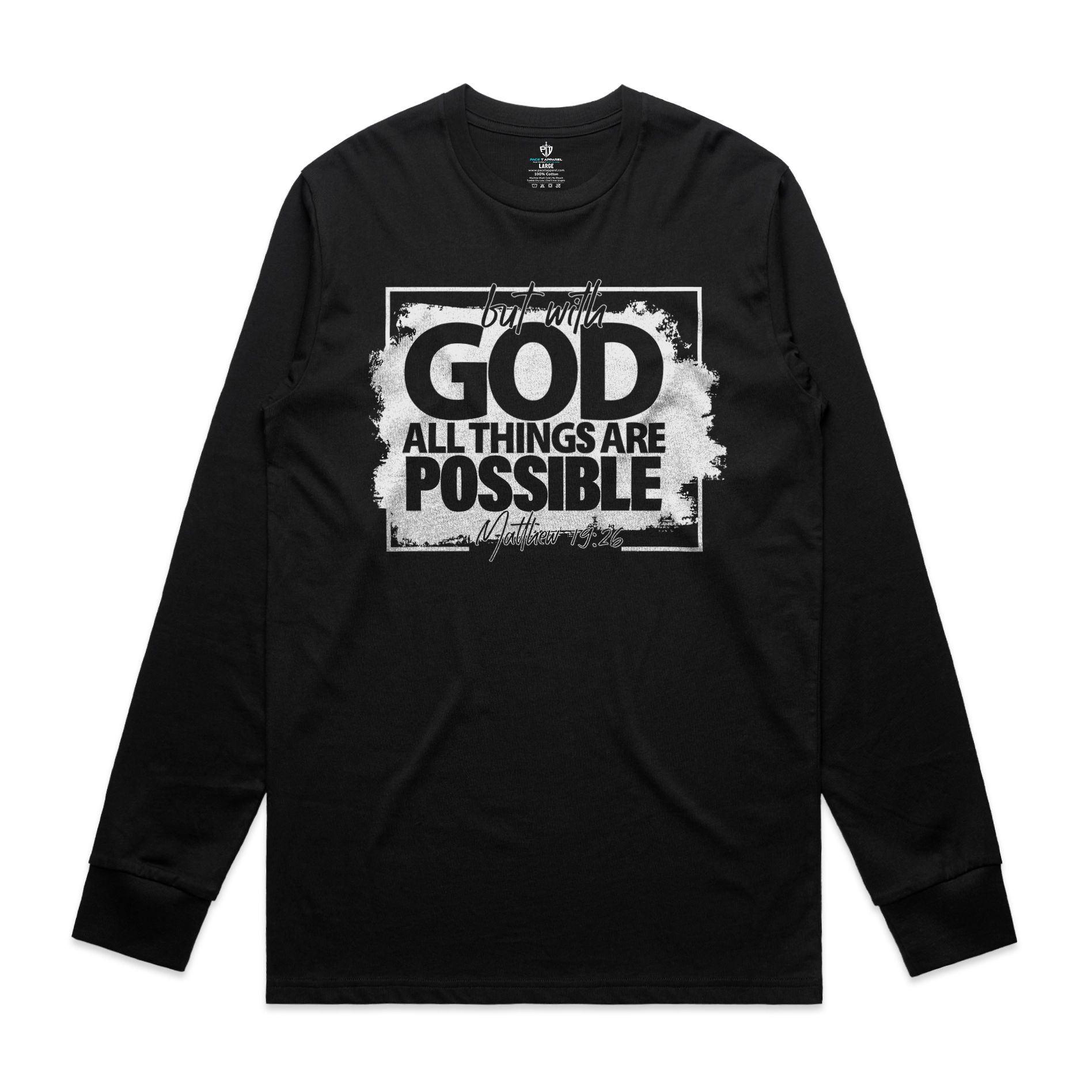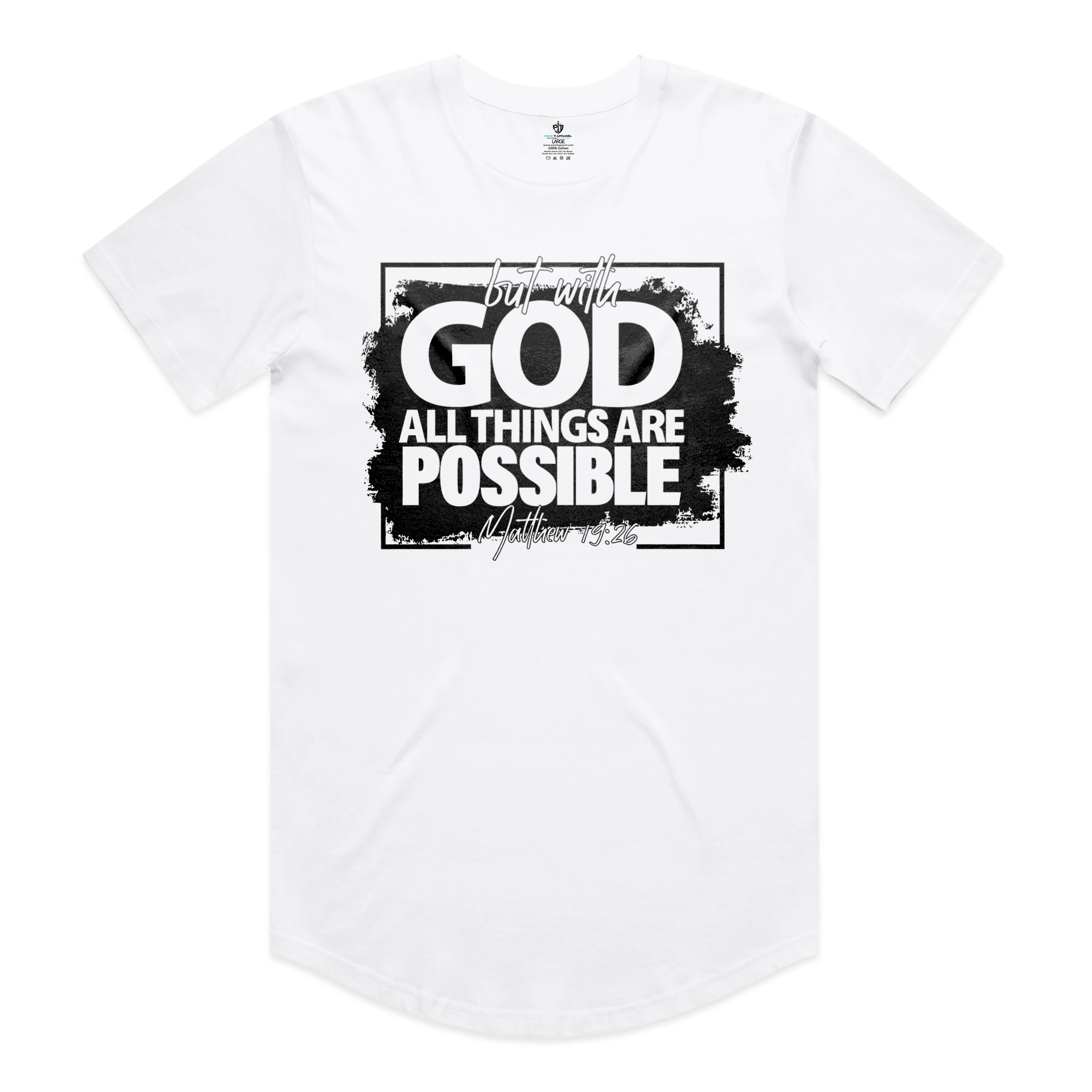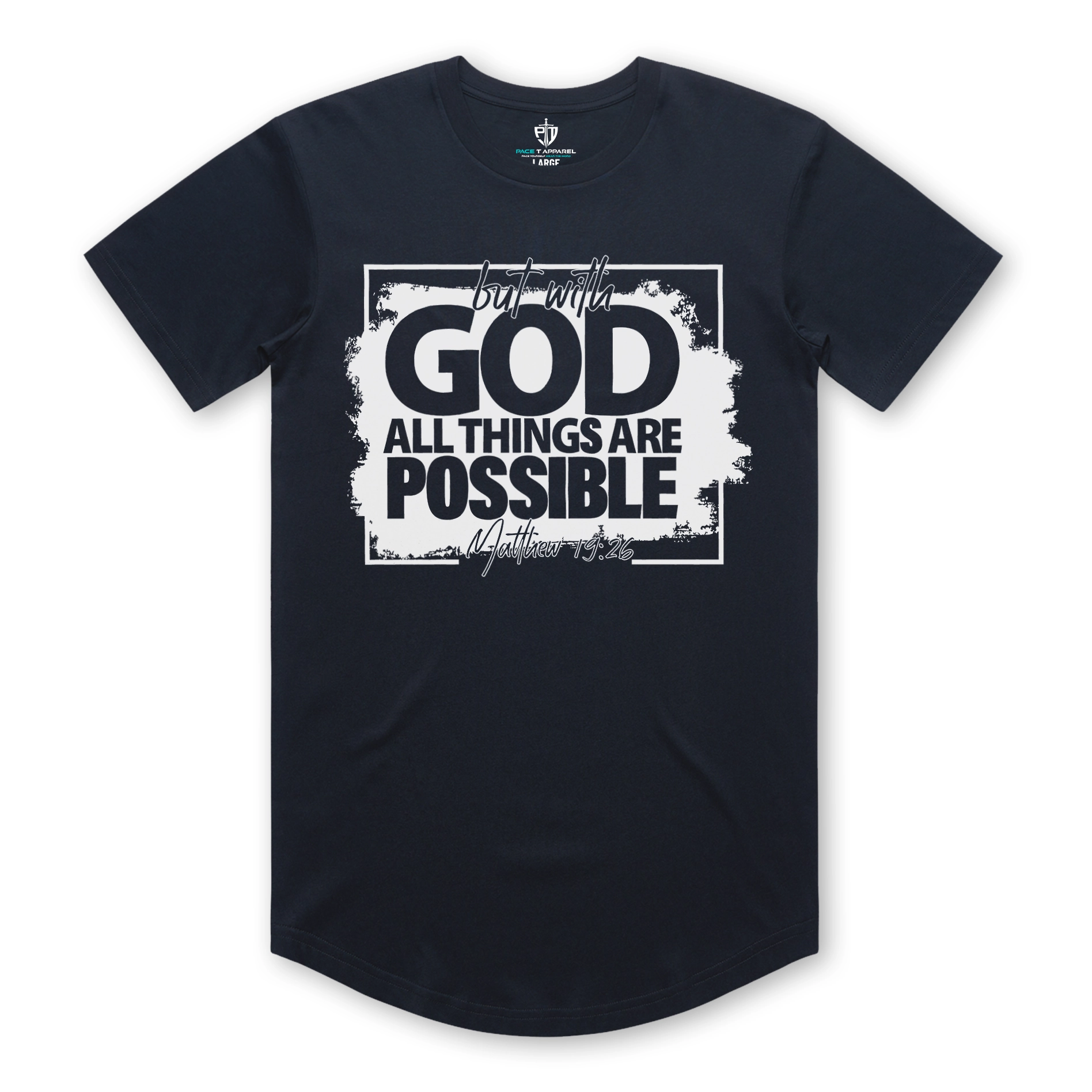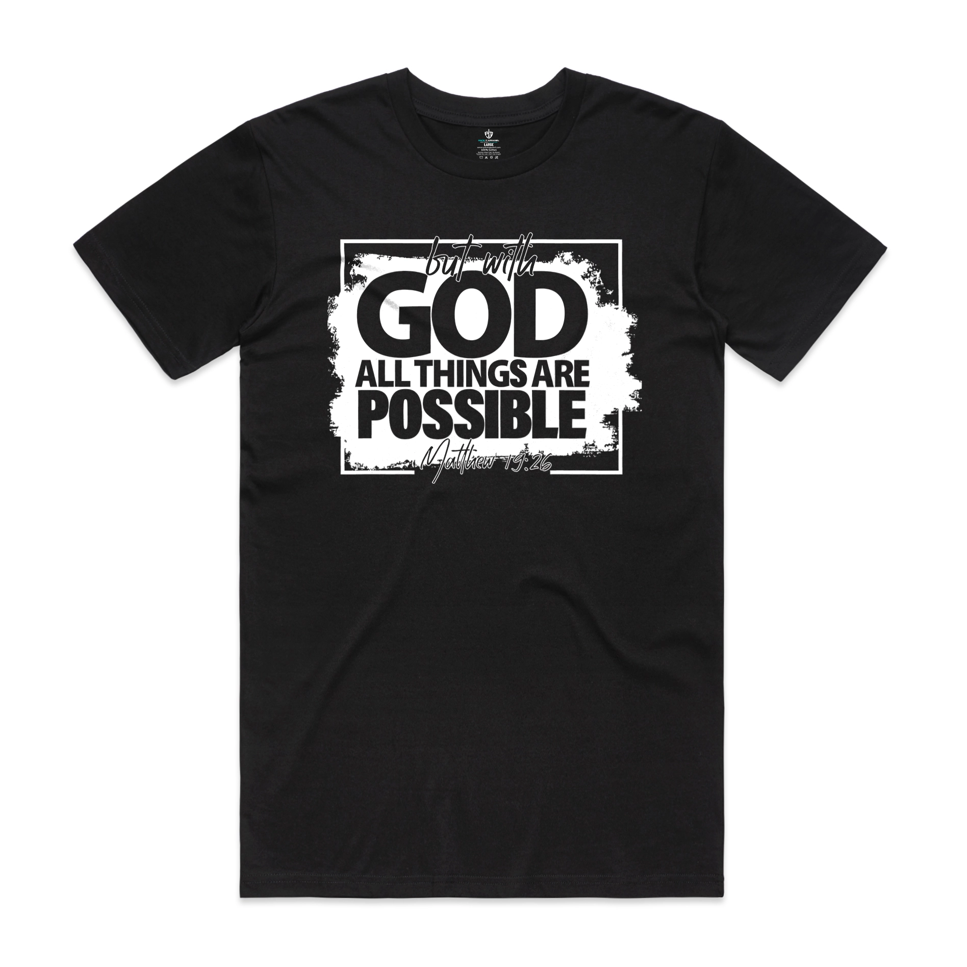 Featuring a striking graphic design with the proclamation “But With God — All Things Are Possible — Matthew 19:26” framed in a bold brushstroke border, this shirt commands attention while carrying a message that speaks directly to the heart. The high-contrast black and white design is clean, powerful, and unmistakably faith-forward.